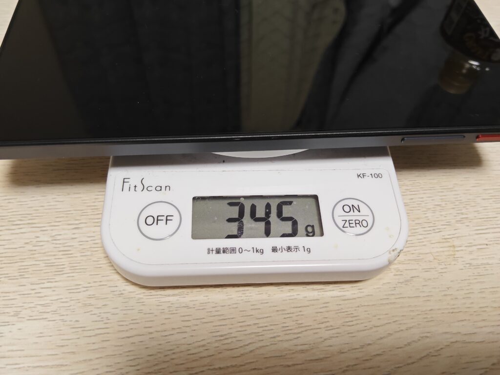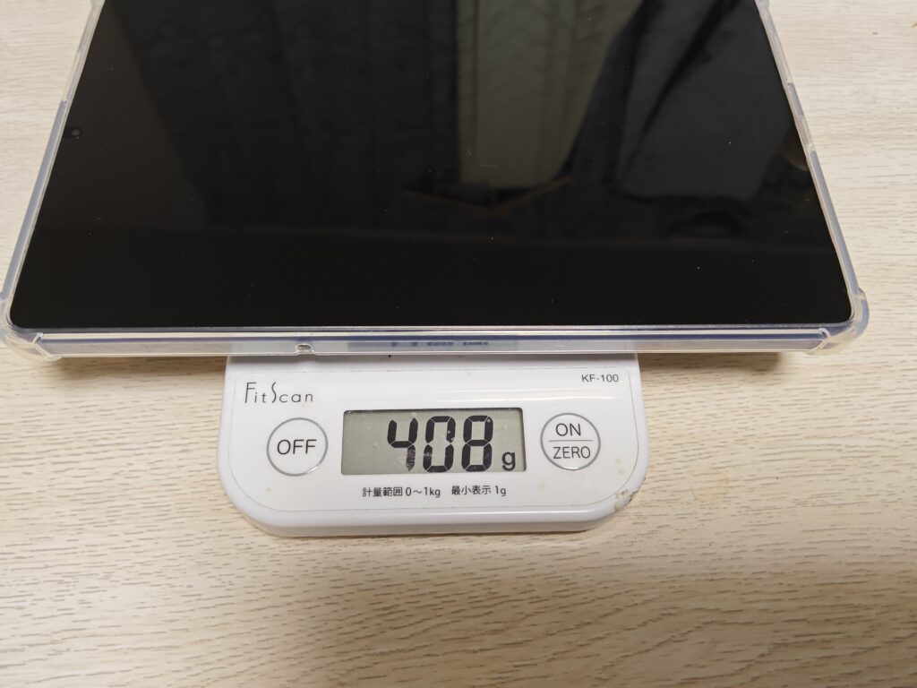 重量は単体で345g、Amazonで買ったサードパーティ製のケースを付けて405gです。