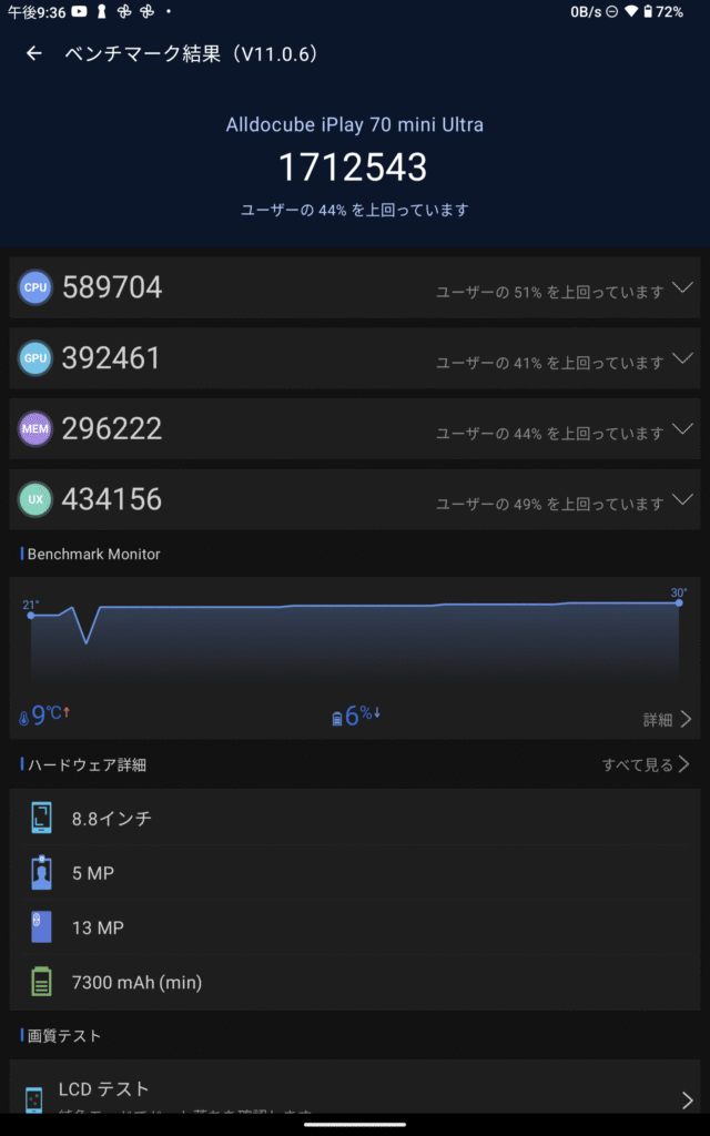 実際にAntutuベンチマークを測定してみると171万点ほどと高い結果でした。